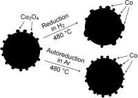 Cobalt oxide supported on N-CSs (ca. 700 nm), prepared by deposition precipitation and autoreduced by the carbon supports, gives good performance as a catalyst for Fischer–Tropsch synthesis, better than that achieved by similar catalysts reduced with hydrogen. This effect is related to the trapping of the cobalt in cavities on the eroded carbon surface.
