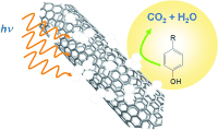 A multiwalled carbon nanotube-titanium dioxide catalyst produced by a sol–gel method shows a high activity in the photocatalytic degradation of para-substituted phenols containing electron-donating groups. A synergetic effect is ascribed to the action of the carbon nanotubes as sensitizers, injecting electrons in the conduction band of the semiconductor, thereby increasing the efficiency of the photocatalytic process.