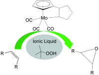 Is that a final ansa? Different room temperature ionic liquids (RTILs) are examined as solvents in the biphasic epoxidation of selected olefins with the ansa compounds 1 and 2 as catalyst precursors. Turnover frequencies of up to 44 000 h−1 are reached and the catalyst can easily be separated and recycled.
