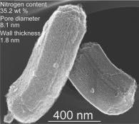 Mesoporous silicon (oxy)nitrides withregular pore structures were prepared by nitridation of mesoporous silica MCM-41, SBA-15, and MCM-48 with ammonia. The nitrogen contents were 35–39 wt.-%. The reaction rates were dependent on the surface areas. Characterization revealed no collapse of the regular pore structure through the nitridation.